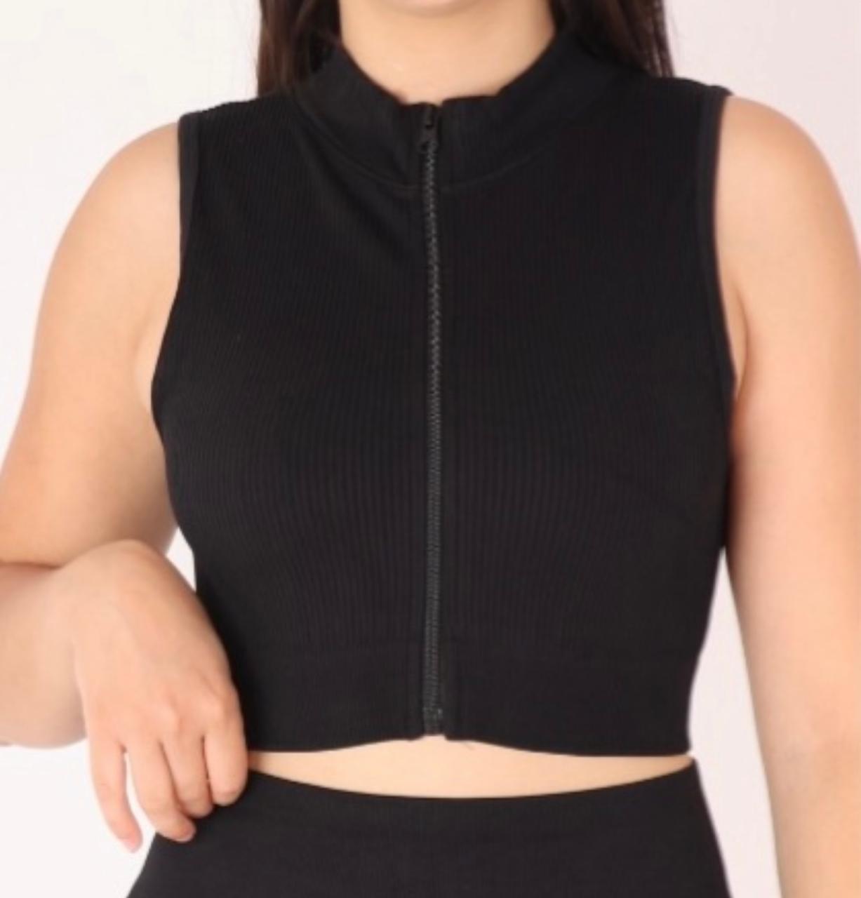 Top deportivo con cierre frontal, confeccionado en mezcla de poliéster y spandex, lo que entrega elasticidad, comodidad y buena transpiración.